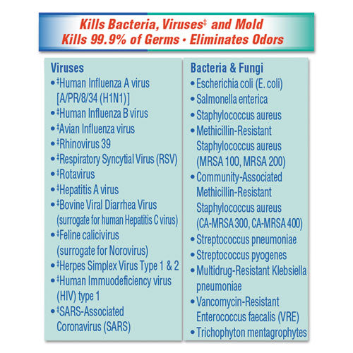 Clorox® Disinfecting Spray kills relevant bacteria, viruses and fungi that can cause serious illness and infection. It is EPA-registered to kill as many as 64 microorganisms and it kills the majority of bacteria on its EPA Master Label in 3 minutes. With incredible versatility, Clorox® Disinfecting Spray can be used on a wide variety of hard surfaces while deodorizing and actually eliminating the bacteria that cause bad odors. From Clorox Commercial Solutions®, this disinfecting spray is ideal for use in offices, day care centers, schools, busy healthcare environments and other commercial facilities. Application: Disinfectant/Sanitizer; Applicable Material: Ceramics; Cement; Fiberglass; Glass; Grout; Laminates; Metal; Plastic; Vinyl; Dirt Types: Bacteria; Fungus; Germs; Mildew; Mold; Viruses; Scent: Fresh.