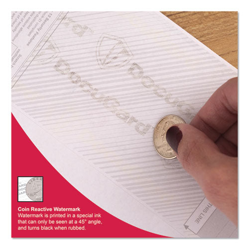 Incorporates security features recommended by the National Check Fraud Center. Compatible with most money management software programs. Security features include: Check-21 compliancy, "VOID" pantograph on the front and back, erasure-resistant background, security warning, anti-splice backer, security features listing, watermark, check verification number, patterned background and microtext print. Standard Marble Top Check. Sheet/Roll Size: 8.5 x 11; Paper Basis Weight (lb): 24 lb; Paper/Media Color(s): Green Marble; Color Family: Green.