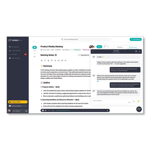 The perfect audio recorder for easily capturing voice recordings including notes, interviews, and small meeting settings. Thanks to its excellent sound quality, long-lasting battery and large extendable memory, it is the ideal alternative to recording with your smartphone. Combined with Sembly's AI Speech-to-Text Cloud Software, you can even turn your recordings into text quickly and accurately. Simply upload your files to Sembly when you are back at your computer and let it automatically convert your recordings to text for you.