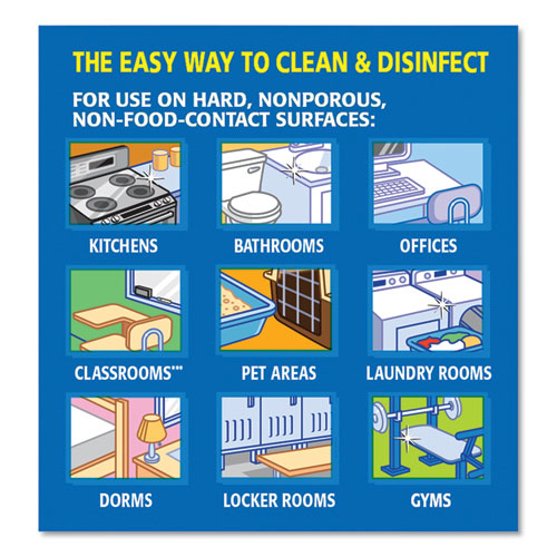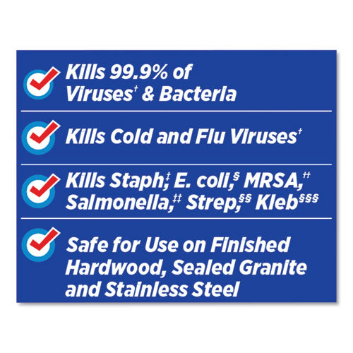 Clean and disinfect multiple surfaces in one easy step. These sanitizing wipes power through grease, soap scum and grime and kill germs that can live on surfaces for up to 48 hours. Each cleaning wipe can effectively kill common bacteria, including staph, salmonella, strep, MRSA, E. coli and the cold and flu viruses, and influenza A2 virus, in as little as 30 seconds. They also remove allergens like cat and dog dander, dust mite debris and pollen. These antibacterial wipes are easy to use and work great on a variety of hard, non-porous surfaces including finished hardwood, stainless steel, mirrors and glass. Ideal for use in schools, restaurants, offices and other commercial facilities. Value Pack—Stock up and save! Towel/Wipe Type: Disinfecting Wipes; Application: Bathrooms; Gyms; Hospitals; Kitchens; Offices; Schools; Day Care Centers; Applicable Material: Acrylic; Ceramic; Chrome; Fiberglass; Glass; Metal; Plastic; Tile; Vinyl; Wood; Material(s): Non-Woven Fiber.