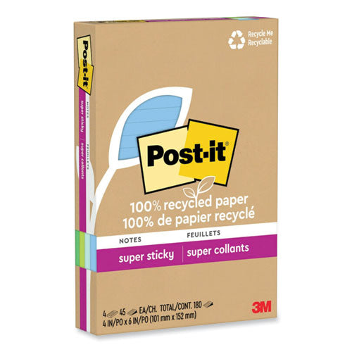 100% Recycled Paper Super Sticky Notes, Ruled, 4" X 6", Oasis, 45 Sheets/pad, 4 Pads/pack