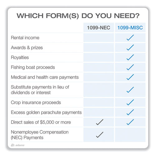 Get everything you need to report miscellaneous income to the IRS. This Adams® Online Tax Kit includes 10 5-Part 1099-MISC sets, 3 1096 summary forms, 10 peel and seal security envelopes and access to Tax Forms Helper® Online, the fast and easy way to file. Tax Forms Helper® Online 2022 will upload your 1099-MISC data directly from QuickBooks Online, or import from a previous year in just a few clicks. You'll use the 1099 MISC to report miscellaneous income to the IRS, including rents, royalties, medical and health care payments, substitute payments in lieu of dividends or interest, and other types of income. As of 2022, the IRS has made the 1099-MISC a continuous-use form with a new fill-in-the-year date field good for multiple tax years.