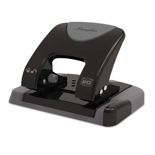 Get powerful 20-sheet punch capacity with a reduced effort operation that makes hole punching 50% easier. Soft grip handle adds a comfortable feel to make any hole punch job a breeze and locks down for storage. Hole pattern in punch base keeps chip tray viewable. Chips can be quickly disposed of through the back door opening or by removing the punch bottom. Extendable paper guide plus built-in ruler and edge guide for better punch alignment. Features durable metal construction. Sheet Capacity: 20; Operating Method: Manual; Number of Holes: 2; Hole Diameter: 9/32".