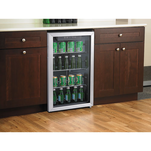 Sleek stainless steel beverage cooler keeps beverages cool and easily available. Convenient triple layer glass front door is frost-free, to better showcase drink choices. Convenient cooler provides plenty of storage, with three adjustable shelves. Holds up to 120 cans. Reversible doors can be installed left or right to fit any configuration. Comes with full-range temperature control and interior light. Quiet, low-energy consumption refrigerator/cooler is perfect in any space. Leveling glides help compensate for uneven floors. Flush back design conceals components and allows a seamless fit in tight spaces. Capacity (Volume): 3.4 Cu. Ft.; Width: 19.38"; Depth: 17.1"; Height: 33.13".