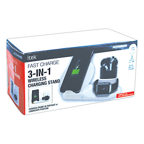 Use the 3-in-1 Wireless Charging stand for all of your Qi Wireless enabled electronics including iPhones®, Apple® Watches, AirPods and all Qi enabled phones. Powered by Type-C Cable which is included, no additional cables needed. Allows you to charge three devices at one time. For Device Type: Mobile Devices; Adapter/Charger Type: Wireless Charging Stand; Power Source(s): USB Port; Connector/Port/Interface: Qi Wireless Charging.