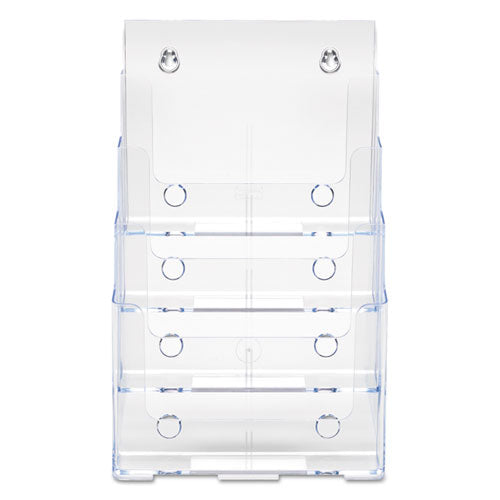 Compact, clear plastic holder. Tiered design offers better visibility and space efficiency. Design is ideal for financial institutions, government buildings, lobbies, libraries and more. Use on countertop or wall-mount (mounting hardware not included). Large 4-Tiered—For magazines, brochures and catalogs up to 1" capacity. Color: Clear; Color Family: Clear; Overall Width: 9.38"; Overall Depth: 7".