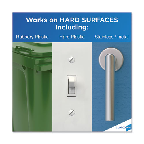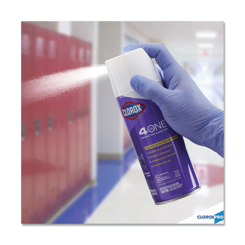 Cleaning for a healthier environment is easier with Clorox 4 in One Disinfectant and Sanitizer. No longer must you settle for an aerosol spray that only disinfects hard surfaces or simply freshens the air or fabrics. Clorox 4 in One disinfects hard surfaces with 24 EPA-registered kill claims. It sanitizes soft surfaces in just 30 seconds and sanitizes the air, killing odor-causing bacteria. It reduces pet dander, dust mite matter and cockroach matter allergens which can trigger allergies and asthma. Ideal for offices, day care centers, schools, hotels, restaurants and other commercial facilities. No precleaning is required. Application: Disinfectant/Sanitizer; Applicable Material: Air; Carpet; Cement/Concrete; Ceramics; Enamel; Fabric; Fiberglass; Glass; Grout; Laminates; Metal; Plastic; Vinyl; Wood; Chemical Compound: Ethanol 66.34%; Dipropylene Glycol 5.31%; Dirt Types: Bacteria; Fungus; Germs; Mildew; Mold; Odors.