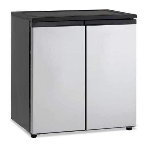 Side-by-Side Refrigerator/Freezer offers a generous 5.5 cubic foot capacity. The refrigerator section has a 3.3 CF capacity, with a 2.2 CF freezer. Attractive black cabinet with platinum-finish doors and molded decorator is the perfect addition to any kitchen or office. Enjoy plenty of storage space, with two fixed shelves in the freezer section and three sturdy, removable/adjustable glass shelves in the refrigerator section. Convenient, adjustable door bins provide extra storage. Interior light in the refrigerator section makes it easy to see what you're reaching for. Capacity (Volume): 5.5 cu ft; Width: 31"; Depth: 23"; Height: 33.5".
