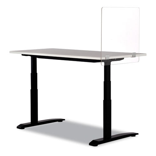Support social distancing and help workers, customers and guests reduce their exposure to droplets produced by coughing, sneezing and talking by installing Wellness Panels from Safco Products in your office, small business, clinic or hospital. Designed to establish a physical barrier between people to help reduce the spread of germs, each panel is sold separately. Combine two panels to create corner "L" shapes for personal desks or service counters or add a third to build a more isolated, three-sided cove workstation. Install panels on flat-edged surfaces that measure one inch thick or greater using the included screws and steel brackets. Each panel features acrylic construction for simple cleaning and maintenance. Screwdriver required for installation and not included. Clear—Allows face-to-face interactions while helping limit physical contact. Color: Clear; Overall Width: 23.5"; Overall Depth: 2.5"; Overall Height: 23.5".
