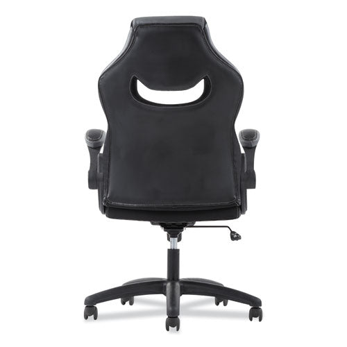 Where quality meets value. Delivers high-tech style and high-performance comfort and support. Innovative design appeals to gamers of all ages. Features bonded leather seat and back with color leather accents and matching detailed stitching. Quickly flip the padded leather arms down whenever you want a little extra support, then flip them up whenever you want more freedom of movement. Trendy chair swivels 360-degrees and features a tilt control that supports a variety of reclining positions, perfect for a variety of gaming postures. Recommended Applications: General Office & Task; Seat Color: Black; Back Color: Gray; Color Family: Gray.