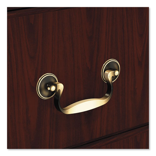 18th century elegance, 21st century engineering. Traditional style with distinctive plinth base and antique brass-plated hardware. Mirror-finish, high-pressure laminate top for ease of care. Woodgrain laminate end panels and drawer fronts. Drawers operate on ball bearing suspensions; file drawers extend fully and accommodate letter or legal size hanging files, box drawers extend three-quarters. Center drawer with central locking system locks all drawers. Series Name: HON® 94000 Series; Worksurface/Base Color: Mahogany; Color Family: Mahogany; Worksurface Shape: Rectangular.