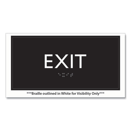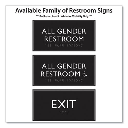 Universally and easily recognizable white graphics. Raised tactile graphics with grade 2 braille. Meets Americans with Disabilities Act (ADA) requirements. Includes double-side adhesive tape for mounting to door or wall.