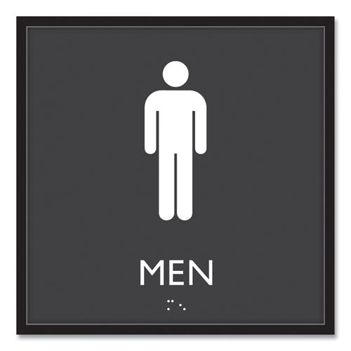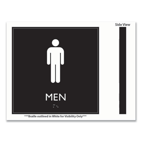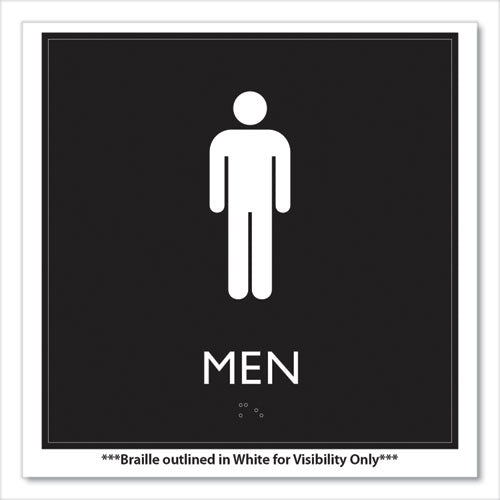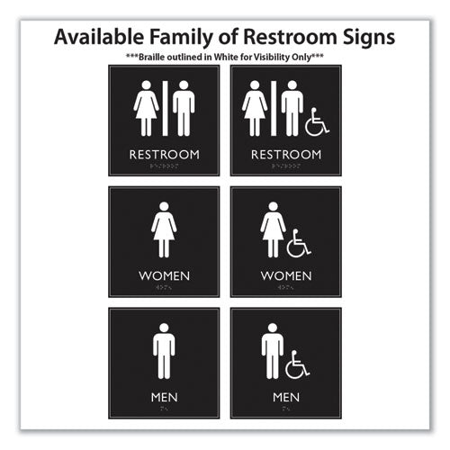 Universally and easily recognizable white graphics. Raised tactile graphics with grade 2 braille. Meets Americans with Disabilities Act (ADA) requirements. Includes double-side adhesive tape for mounting to door or wall.