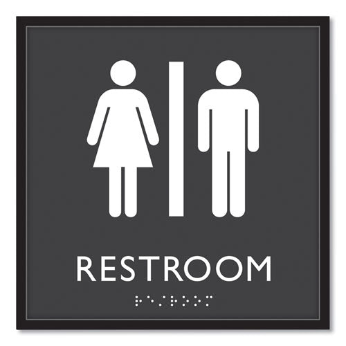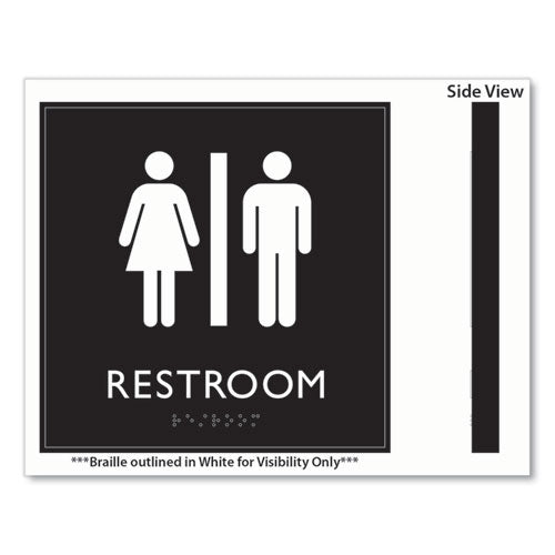 Universally and easily recognizable white graphics. Raised tactile graphics with grade 2 braille. Meets Americans with Disabilities Act (ADA) requirements. Includes double-side adhesive tape for mounting to door or wall.