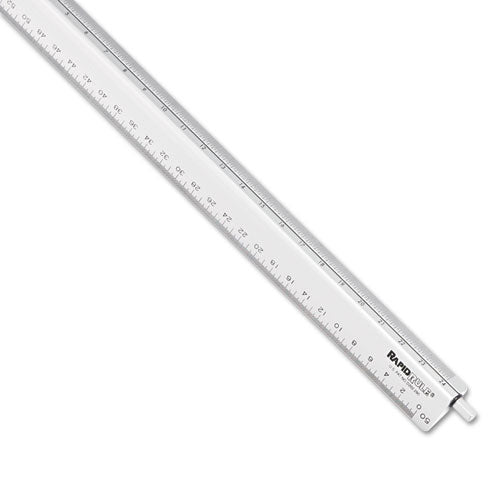 Designed for the exacting needs of engineers. Change units quickly and easily by rotating dial at either end of scale. 12" measuring length, exact calibrations. Highest quality aluminum. Adjusts to 10, 20, 40 and 50 parts to the inch. Aluminum Engineers Ruler, 12", Silver. Ruler Type: Triangular Scale; Length: 12"; Material(s): Aluminum; Color(s): Silver.