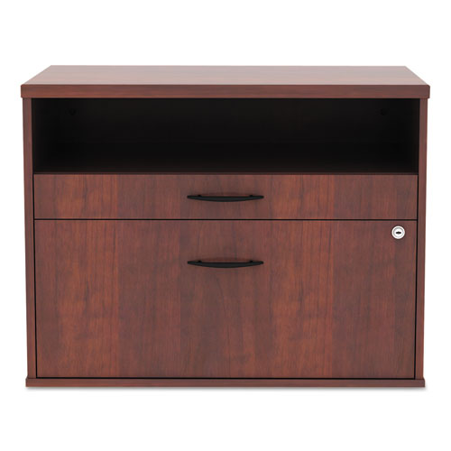 Sturdy low file cabinet great for use for storage or as a low credenza with your desk. Great used as a return to expand your desk space to create "L" or "U" shaped desk configurations. Coordinating laminates for use with Alera® Valencia, Sedina, or Open Office Desk Series. Three storage spaces including lateral file drawer, pencil drawer and open storage. Full extension ball-bearing slides for easy access to everything. Configurable left or right handed. Durable woodgrain laminate is scratch-, dent-, and water-resistant. Leveling glides compensate for uneven floors. Two fold-away safety keys. Accommodates letter or legal filing. Two-Drawer. Color: Medium Cherry; Color Family: Cherry; Overall Width: 29.5"; Overall Depth: 19.13".