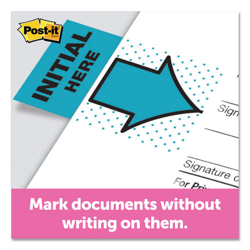 Post-it® 1" Wide Arrow Message Flags help you make sure that you don't miss anyone on your signatory list. Flags stick securely and remove cleanly without damaging your document. Included pack-style dispensers work great alone or can be incorporated into a larger desktop organization system. Color(s): Blue; Color Family: Blue; Message(s): INITIAL HERE; Dispenser: Pop-Up.