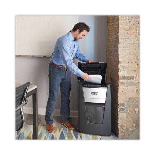 Perfect for any office, the GBC AutoFeed+ Shredder automatically shreds your sensitive documents for peace of mind. Stack sheets in the feeder for automatic shredding or manually feed sheets. Micro-cut (P-5) shred style safely shreds confidential or sensitive documents. Runs ultra-quietly to help minimize noisy disruptions in the office. Powerful induction motor for minutes of continuous run time and large bin lets you shred longer without stopping. A lockable feeding tray provides additional security to your shredded documents. Auto shreds documents, paper clips and staples, while credit cards must be manually inserted.