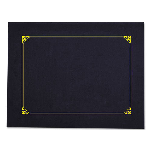 This premium document cover provides an elegant touch to any certificate or award presentation. The heavy-duty cover features a linen textured finish and a gold foil border design for a classic and elegant look. Includes die-cut tabbing to hold 8.5" x 11", 8" x 10" and A4 certificates. Includes link to create custom award certificates. Overall size is 12 1/2" x 9 3/4". Color(s): Navy; Width: 9.75"; Height: 12.5"; Insert Size: 8.5 x 11; 8 x 10; A4.