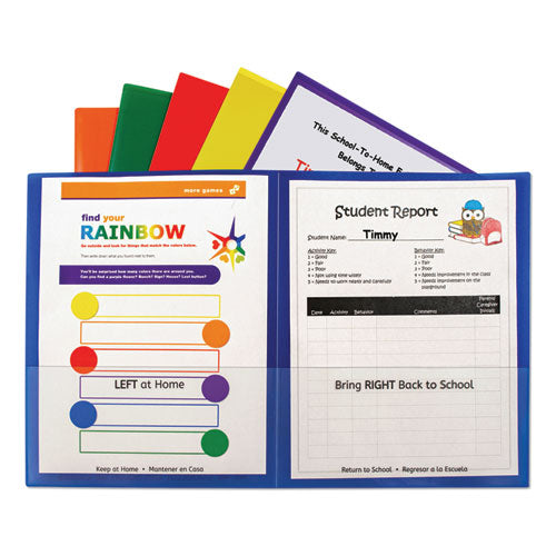 Make the connection between school and home stronger with these school-to-home two-pocket folders. Keep parents and caregivers informed with daily updates on lessons, projects, behavior and more. The interior pockets are imprinted with "Home" and "School" designations, in both English and Spanish. Front and back cover pockets are clear, making them great for custom student cover sheets. Made of durable polypropylene. This product will be cheerfully replaced with one of equal value if defective in materials, manufacturing or packaging at the time of purchase. Except for such replacement, this product is sold without warranty or liability even though defect, damage or loss is caused by negligence or other fault.