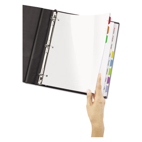 Professional looking dividers that allow you to easily create or update section titles. Durable, clear plastic dividers, customizable section title page, and sheet protector work together to provide a clean professional look. Clear dividers allow you see through to the section titles located in the back of your binder. Provides a quality look that is great for projects, presentations, proposals, and keeping things organized. Print section titles on a plain letter-size sheet of paper and insert into the included sheet protector. Place sheet protector as the last page of the binder. To update section titles or reuse your dividers, simply print a replacement sheet and you’re ready to go – no labels necessary. Free and easy to use Avery templates available from Avery Print & Design make it easy to customize your section titles. Tabs are also writeable with pen, pencil or marker. Index Divider Style: Customizable; Index Divider Size: 11 x 8.5; Punched/Unpunched: 3-Hole Punched; For Use With: Ring Binders.