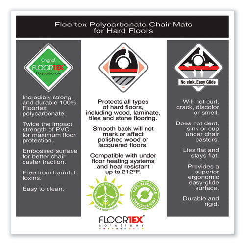 Floortex Original Polycarbonate chair mats provide the ultimate quality, durability and clarity. Twice the impact strength of vinyl to provide a perfect easy glide ergonomic surface for caster based chairs. Polycarbonate will not curl, crack, dimple, discolor or smell under normal use. High clarity allows the beauty of flooring to shine through. Manufactured using up to 30% renewable energy. Smooth back for hard floors. Mat Type: Chair Mat; Application: Hard Floors; Width: 48"; Length: 53".