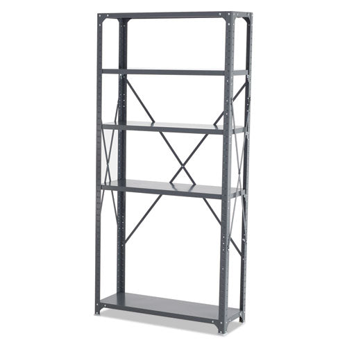 Durable box beam design. Double-sided compression clips support loads up to 750 lbs. per shelf (evenly distributed). Shelves lock in place but can be easily repositioned in 1" increments. Post kits included with each shelf pack. Color: Dark Gray; Overall Width: 36"; Overall Depth: 12"; Overall Height: 75".