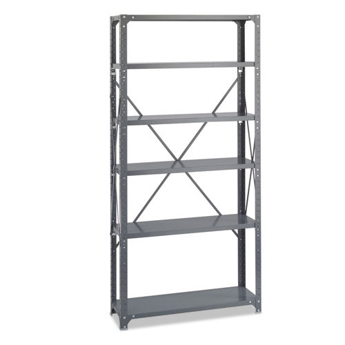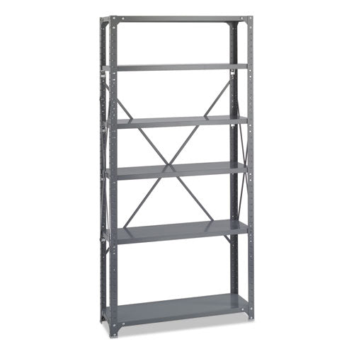 Durable box beam design. Double-sided compression clips support loads up to 750 lbs. per shelf (evenly distributed). Shelves lock in place but can be easily repositioned in 1" increments. Post kits included with each shelf pack. Color: Dark Gray; Overall Width: 36"; Overall Depth: 12"; Overall Height: 75".