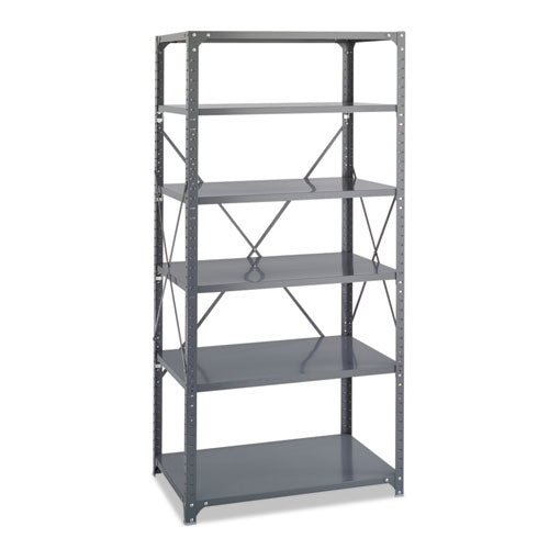 Durable box beam design. Double-sided compression clips support loads up to 750 lbs. per shelf (evenly distributed). Shelves lock in place but can be easily repositioned in 1" increments. Post kits included with each shelf pack. Color: Dark Gray; Overall Width: 36"; Overall Depth: 24"; Overall Height: 75".