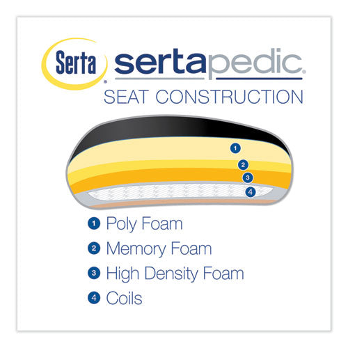 Pivot Reactive Ergonomic Support, PRESS, back health technology is a fully articulating backrest that offers continuous lumbar support at any back angle. SertaPedic® comfort support system with layers of molded foam, memory foam, and pocket coils. Upholstered in black commercial grade bonded leather. Flip up arms with soft arm rests. Pneumatic lift with tilt tension adjustment and lockout feature. Five-star nylon base with casters for easy mobility. Supports up to 275 lbs. Recommended Applications: Executive & Management; Seat Color: Black; Back Color: Black; Color Family: Black.