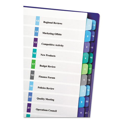 When you've got a big project, flex your organizational muscle with Double-Column Ready Index® Dividers. Designed to handle big projects easily and professionally, these multicolor tab dividers make it a snap to keep everything in order. The Table of Contents page features two columns so you have more space for your text, and it's easy to customize using the free quick-fill templates from Avery Design & Print. You'll get an innovative double-layer format that are easy to view and access. And because these dividers feature more durable paper, stronger tab reinforcement and double-sided hole reinforcement, you can rest assured they'll stand up to frequent use. Get a big boost in organizational power with the Double-Column Ready Index Dividers. For laser and inkjet printers. Index Divider Style: Arabic Numeric; Index Divider Size: 11 x 8.5; Punched/Unpunched: 3-Hole Punched; For Use With: Ring Binders.