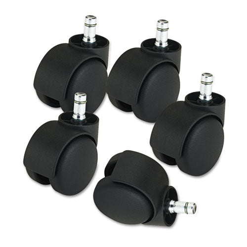 Take the guesswork out of caster stem selection. Includes five wheels and 10 stem fasterner; 5 each 7/16" x 7/8" and 5 each 3/8" x 7/8" to fit most metal bases. Deluxe Futura Casters—2 3/16" diameter euro-style caster fits bases with 1-1/2" dia. oversized necks to make the caster and base appear as one. Weight rated 120 lbs. per caster wheel. Caster/Glide/Wheel: Grip Ring Stem Twin Wheel Casters; Color: Matte Black; Stem Type: B; K; Weight Capacity (text): 120 lbs Per Caster.