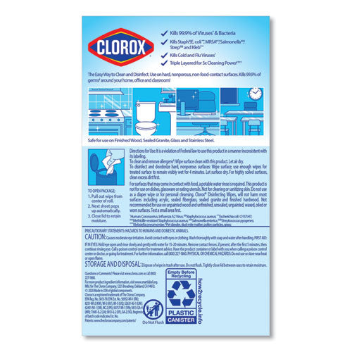 CloroxPro™ Disinfecting Wipes clean and disinfect in one easy step. These disinfecting wipes are EPA-registered to kill 99.9% of germs on hard nonporous surfaces, including cold and flu viruses, the COVID-19 virus (SARS-CoV-2), E. coli, Salmonella, Staph, Strep, MRSA and the organism that can cause whooping cough. These wipes also remove common allergens like pet dander, pollen particles and grass. One wipe kills most viruses in as little as 15 seconds on a wide variety of surfaces. The premoistened, thick, antibacterial wipes are perfect for spills and dirt on a variety of hard, nonporous surfaces including acrylic, glass and vinyl. They quickly clean and disinfect high-touch germ hot spots such as doorknobs, handrails and faucets and are suitable for use on phones, keyboards and mouse. These sanitizing wipes are ideal for use in shared public spaces, offices, athletic facilities, schools, day care centers, busy healthcare environments, long term care and other commercial facilities. Value Pack—Stock up and save! Towel/Wipe Type: Disinfecting Wipes; Application: Bathrooms; Gyms; Hospitals; Kitchens; Offices; Schools; Day Care Centers; Applicable Material: Acrylic; Ceramic; Chrome; Fiberglass; Glass; Metal; Plastic; Tile; Vinyl; Wood; Material(s): Non-Woven Fiber.