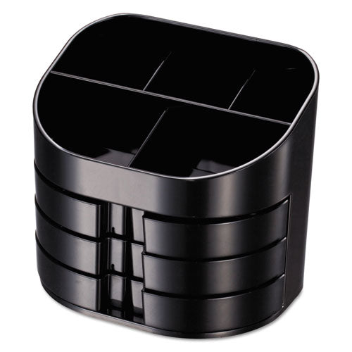 Keep your desktop supplies within easy reach with this compact, double supply organizer. Has six swing-out compartments plus two additional compartments for clips, staples, erasers, etc. Three stepped compartments hold writing instruments. Desktop Supplies Organizer Type: Multipurpose; Number of Compartments: 11; Number of Drawers: 6; Overall Width: 6 1/2".