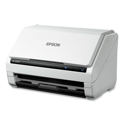 Delivering high-quality scans at up to 35 ppm/70 ipm, the DS-575W II color scanner offers efficient document management for busy businesses. Get easy wireless setup with the Epson Smart Panel™ app. Wirelessly scan to smartphones, tablets or online storage accounts. Quickly scan stacks of pages via the 50-sheet ADF. Included TWAIN and ISIS® drivers ensure easy integration with most existing software, while a peak daily duty cycle up to 4,000 sheets helps enhance productivity. Scan Size (W x H): 8.5" x 240"; Color Bit Depth: 30-bit; Grayscale Bit Depth: 24-bit; Connector/Port/Interface: USB 3.0; Wireless (802.11b/g/n).