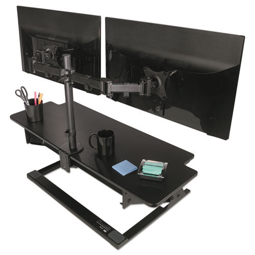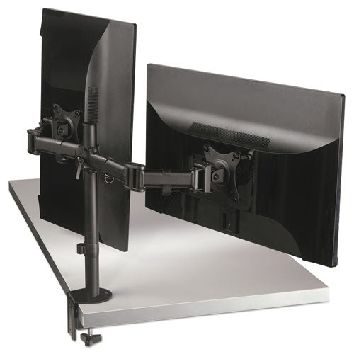 Free up valuable desk space and bring your monitor to a comfortable viewing height and distance while sitting or standing. Sturdy steel construction holds two monitors up to 28.5" width and 20 lb each. Easily clamp mounts to surfaces up to 3.25" thick, no tools needed (grommet mount also available). Cord management clips on the arms and pole. Fully adjustable. OEM/Compatible: Compatible; Workstation Type: Mobile Workstation; Traditional Desk/Table; Width (Min): 28.6"; Width (Max): 33".