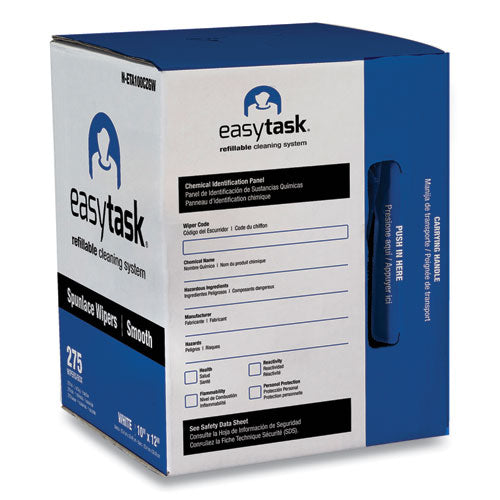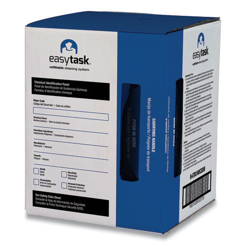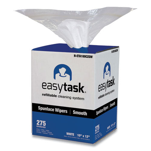 Easytask Refillable Cleaning System, create your own pre-sat wiper. Portable GrabBox contains centerpull roll in a resealable bag. Sanitizer/disinfectant compatible, holds half gallon of solution. Spunlace wiper offers excellent absorbency. Maximum strength, no lint, no binders and solvent resistant for general purpose wiping. Refill for the GrabBox of other delivery system. Towel/Wipe Type: Center-Pull; Application: General Use; Material(s): Spunlace; Number of Plies: 1.