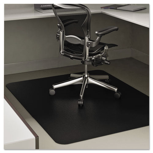 Non-studded design protects hard floor surfaces from caster wear, spills and heavy traffic. Ideal for all-day use on wood, tile, laminate and other hard floors (Not suitable for use on concrete floors). Easy-glide rolling surface provides effortless chair movement. Free & Clear® non-orthophthalate, non-cadmium formula promotes a healthy work environment while offering exceptional clarity and durability. Classic straight edge finish. Black. Mat Type: Chair Mat; Application: Hard Floors; Width: 45"; Length: 53".