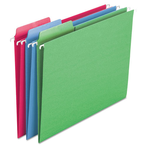 Hanging file folders are designed with an erasable surface that makes it possible to revise and reuse them. You can write directly on the tab with a permanent marker and easily erase with a standard white eraser. These folders have built-in reinforced tabs attached to the folder for hassle-free filing. No assembly required. Folder Size Type: Letter; Folder Color: Assorted; Color Family: Multicolor; Folder Color Assortment: Blue; Green; Red.