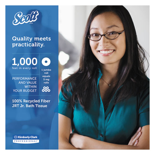 Scott Essential provides reliable balance of efficiency, performance and value. You have better things to think about than changing your business' toilet paper rolls! Scott Essential 1000 2-ply Jumbo Toilet Paper Roll is a reliable and practical choice for your restroom. One roll of this high-capacity tissue is 1,000 feet long and equals nearly five standard rolls. This large toilet paper roll is designed to fit in dispensers made to accommodate two rolls, so the system is ideal for high-traffic areas, reducing run-outs and refills. In addition, it's made with 100% recycled fiber (RF) and it meets EPA standards for minimum post-consumer waste content. Scott Essential Jumbo Roll 2-ply Bathroom Tissue offers great value and is the ideal balance of strength, absorbency and economy. With Scott Essential Brand products, you get the quality and performance you can count on – and still stay within your budget. Tissue Type: Toilet; Number of Plies: 2; Length: 1,000 ft; Width: 3.55".