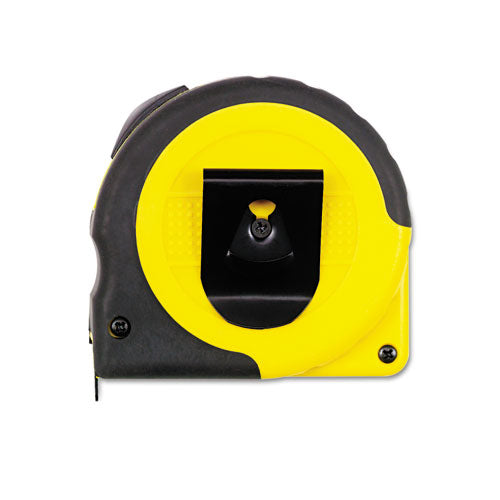 Tape measure features fractional marks to make measuring easy. Rubberized cover with comfort grip. Positive lock holds blade securely. Includes belt clip. Blade Length: 25 ft; Scaling System: Fractional; Blade Material: Metal; Blade Color: Yellow.