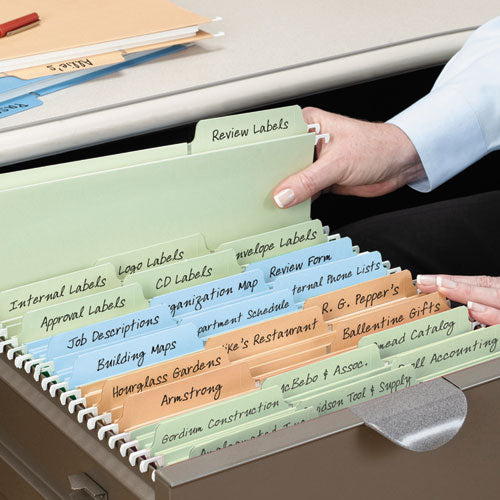 Built-in heavy-duty tabs for quick and easy labeling—no plastic tabs required. Reinforced construction for extra durability and longer life. Easy to label. Folder Size Type: Letter; Folder Color: Assorted; Color Family: Multicolor; Folder Color Assortment: Camel; Lake Blue; Moss.