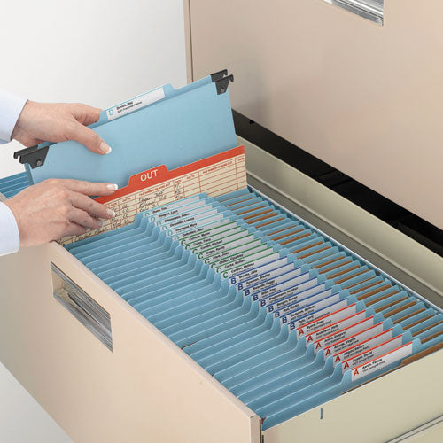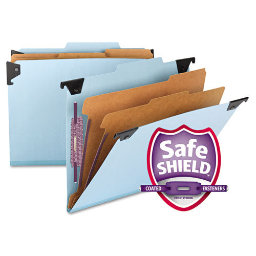 The heavy-duty portable solution - simply remove from drawer, fold down hangers and you have a classification folder ready to go. Features SafeSHIELD® coated fasteners to reduce paper tears, finger cuts and excessive fastener crinkling. Folder Size Type: Letter; Max Folder Expansion: 2"; Folder Color: Blue; Color Family: Blue.