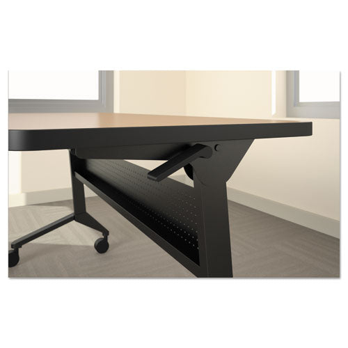 Dual-sided levers for a quick-flip of the top. Tables nest for compact storage. Steel base with integrated modesty panel with built-in cable trough. Four locking casters. For 48" Table Tops. Base Color: Black; Overall Width: 46 7/8"; Overall Depth: 21 1/4"; Height Maximum: 27 7/8".