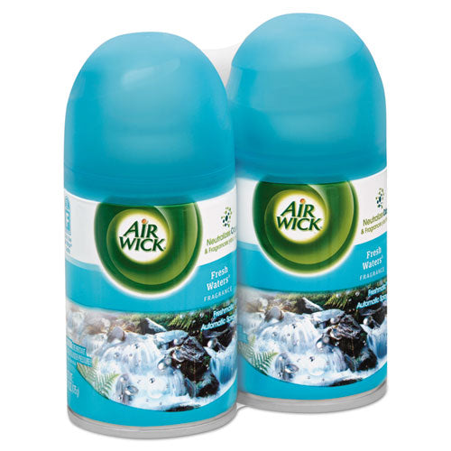 Each refill lasts up to 60 days for a continuous fresh smell. Adjustable intensity settings allow you to strengthen the scent based on your own preferences. Refills adapt to all Air Wick® Freshmatic® Dispensers. Use in hotels/motels, health care facilities, nursing homes, office buildings, industrial facilities and restrooms. Twin Refill Pack. Scent: Fresh Waters®; Physical Form: Liquid; Application: Automatic Odor Control; Capacity (Volume): 5.89 oz.