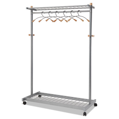 Stylish combination of steel tubing and wood detail. Features six accessory hooks and four casters, two locking. Holds up to 36 garment hangers. Six hangers included. Double-Sided, Two-Shelf Rack—Top and bottom shelves for storing hats and cases. Mounting: Stand Alone; Width: 44.8"; Depth: 21.67"; Height: 70.8".