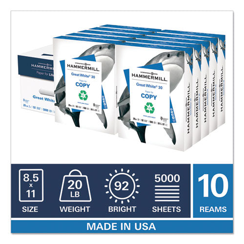 Great White 30 Recycled Print Paper, 92 Bright, 20lb, 8.5 X 11, White, 500 Sheets-ream, 10 Reams-carton