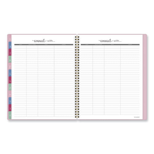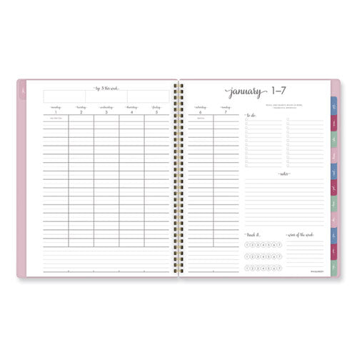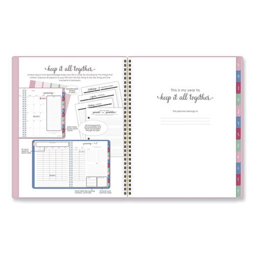 Keep it all together in Harmony this year. The Harmony Weekly/Monthly planner provides the unique layouts and special pages you need to capture just about every aspect of your life so you can focus on the things that matter. One week per two-page spread features plenty of space for each day as well as dedicated areas for your week's goals, wins, to-dos and more. Tabbed for easy navigation, each one month per two-page spread features unruled daily blocks along with areas for the month's goals, to-dos, notes and ideas. In the back of the book, a wide range of resources along with both formatted and unformatted notes and planning pages help you do everything from prioritizing your biggest projects to finding the perfect gifts for the special people in your life. Color-coded repositionable stickers make it easy to add and remove eye-catching notes to all of your important projects, events, appointments and more. Durable, stylish poly cover with gold twin-wire binding adds an element of gratifying sophistication to every practical task, and the double-sided interior pocket hangs onto any loose materials you’d like to keep close. Printed on high-quality paper for superior ink-bleed resistance.