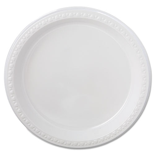 Premium-grade dinnerware provides superior strength and durability. Decorative, raised-rim border features a tasteful, contemporary design. Gloss-finished heavyweight plastic ensures rigid, cut- and leak-proof performance. Nesting, stackable pieces help you conserve storage space. Heavyweight Three-Compartment Plate. Dinnerware Type: Compartment Plate; Material(s): Plastic; Shape: Round; Diameter: 10 1/4".
