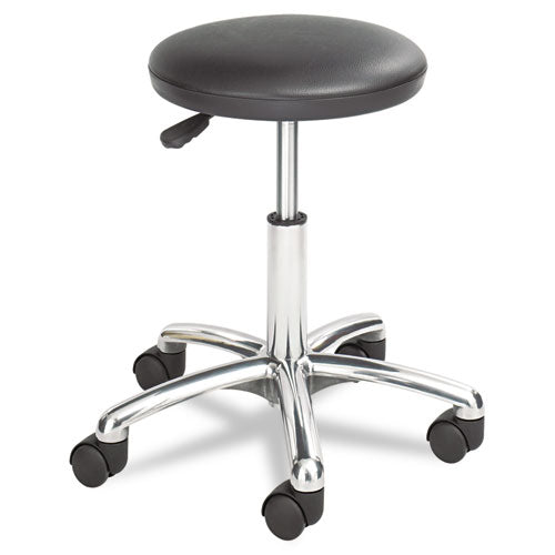Easy-to-clean vinyl upholstered stool is ideal for medical and educational settings. Pneumatic lift adapts to different work surface heights. 18 " five-star base and casters offer support and mobility. Recommended Applications: General Office & Task; Healthcare; Seat Color: Black; Back Color: Black; Color Family: Black.